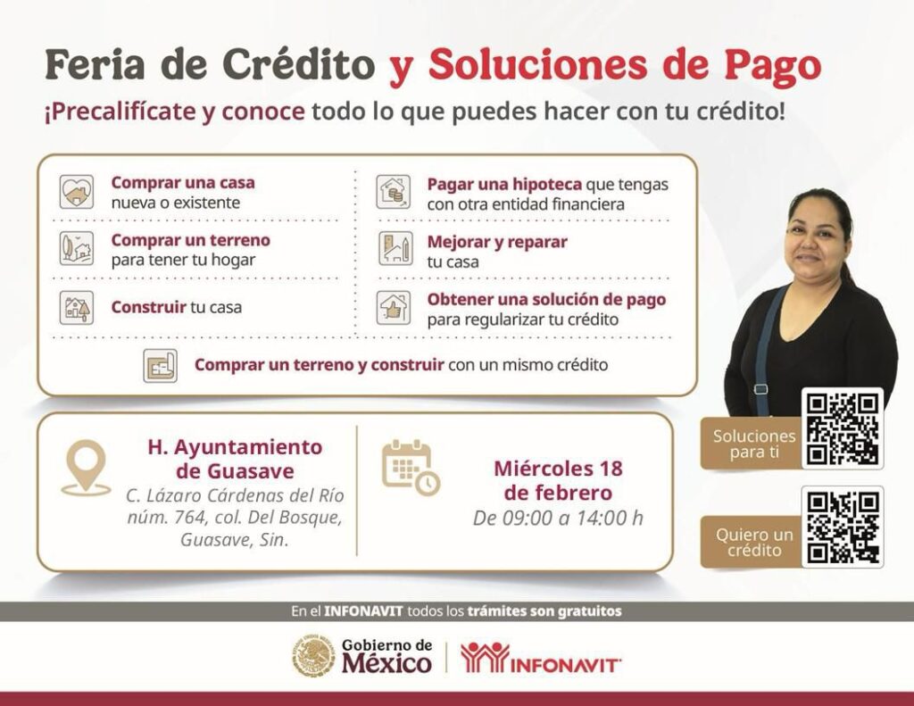 Guasave, Sinaloa.- El Instituto del Fondo Nacional de la Vivienda para los Trabajadores (INFONAVIT) realizará este miércoles 18 de febrero la Feria de Crédito y Soluciones de Pago en el Ayuntamiento de Guasave, con el objetivo de orientar a trabajadores sobre las...