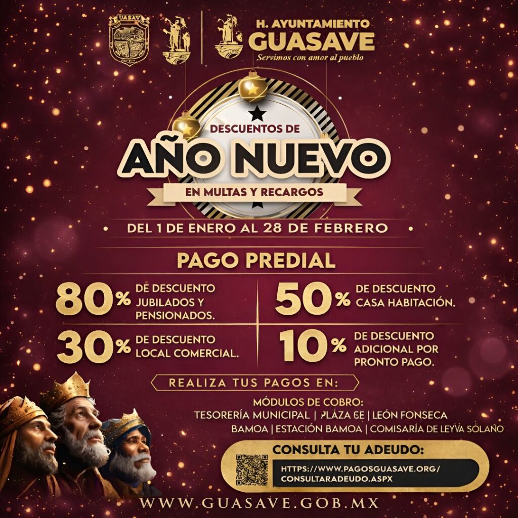 Con el objetivo de apoyar la economía de las familias guasavenses y fomentar la cultura del cumplimiento fiscal, el H. Ayuntamiento de Guasave anunció el programa de Descuentos de Año Nuevo en multas y recargos del impuesto predial, vigente del 1 de enero al 28 de febrero de 2026.