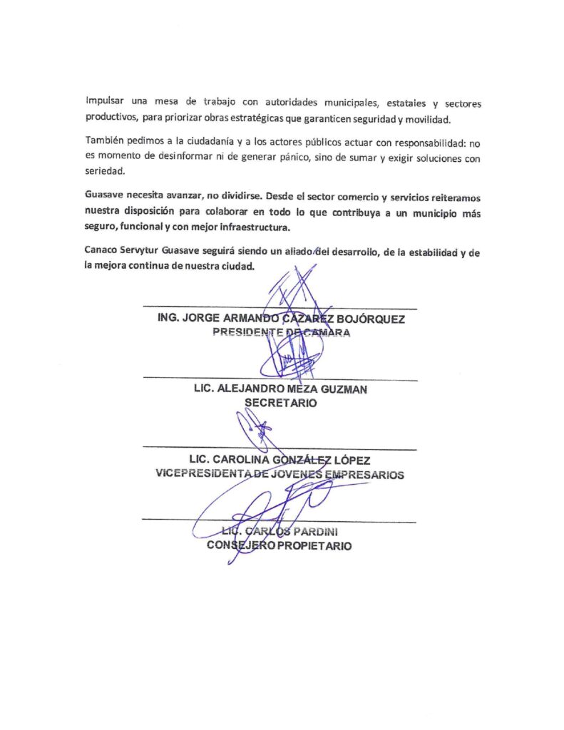 Finalmente, CANACO exhortó a la ciudadanía y a los actores públicos a actuar con responsabilidad, evitando generar pánico o desinformación, y apostando por sumar esfuerzos para exigir soluciones con seriedad. Reiteró su disposición para colaborar en todo lo que contribuya a un Guasave más seguro, funcional y con mejor infraestructura, destacando que seguirá siendo un aliado del desarrollo y la estabilidad del municipio.