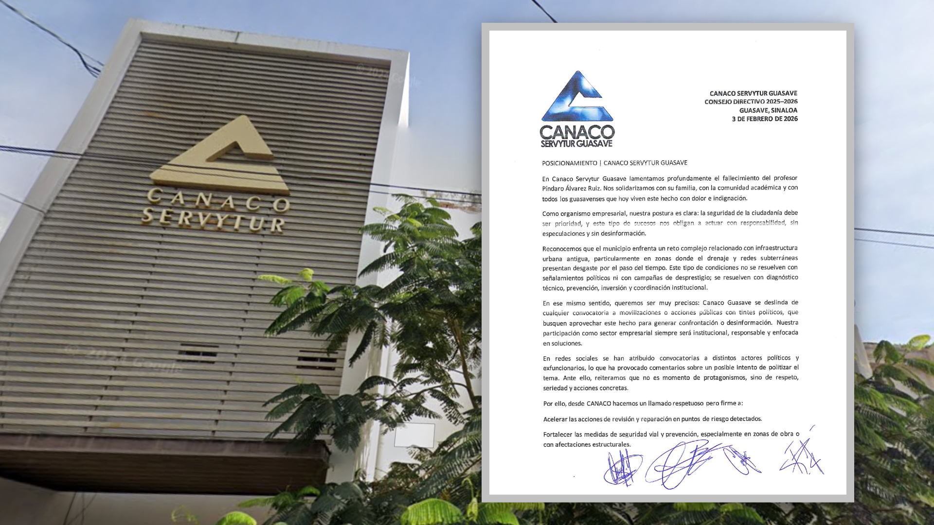 Guasave, Sinaloa; 3 de febrero de 2026.- La Cámara Nacional de Comercio, Servicios y Turismo (CANACO) Guasave fijó postura este martes tras el fallecimiento del profesor Píndaro Álvarez Ruiz, expresando su solidaridad con la familia, la comunidad académica y la sociedad guasavense, en un momento marcado por dolor e indignación.