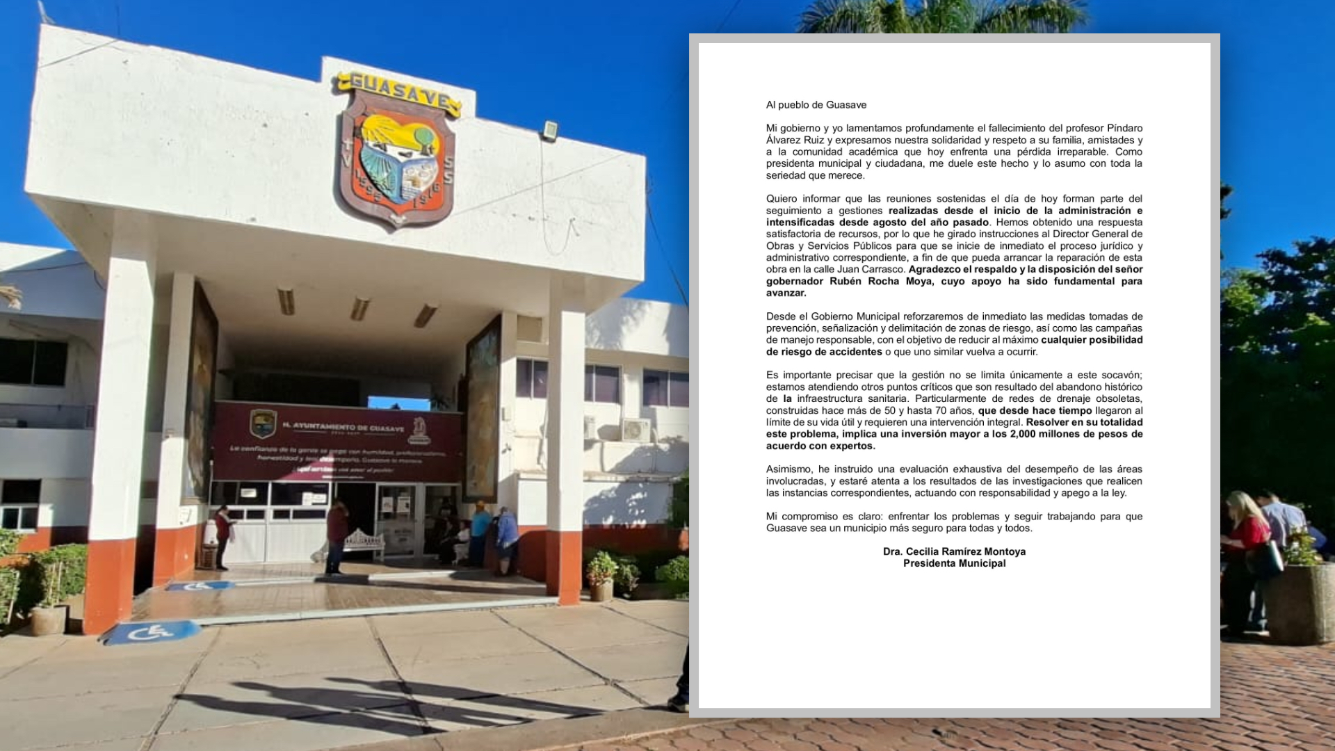 La presidenta municipal de Guasave, Dra. Cecilia Ramírez Montoya, dirigió un mensaje a la población para expresar su pesar por el fallecimiento del profesor Píndaro Álvarez, y manifestó su acompañamiento a sus seres queridos, amistades y al sector educativo del municipio.
