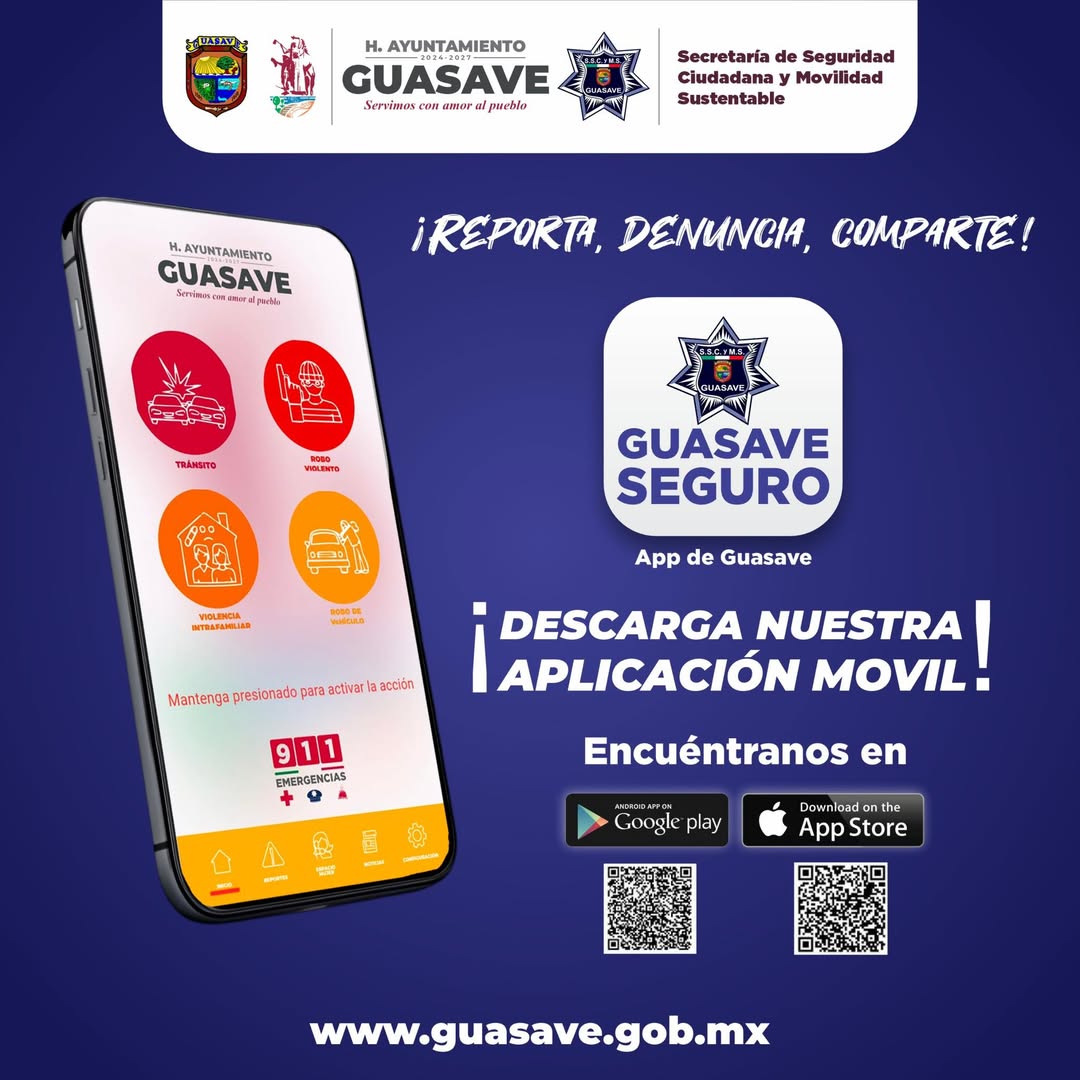 Guasave, Sinaloa.– El Ayuntamiento de Guasave, a través de la Secretaría de Seguridad Ciudadana y Movilidad Sustentable, presentó la nueva aplicación “Guasave Seguro”, una herramienta digital diseñada para realizar denuncias y reportes ciudadanos de manera rápida y sencilla, con el objetivo de agilizar la atención de emergencias y fortalecer la prevención del delito.