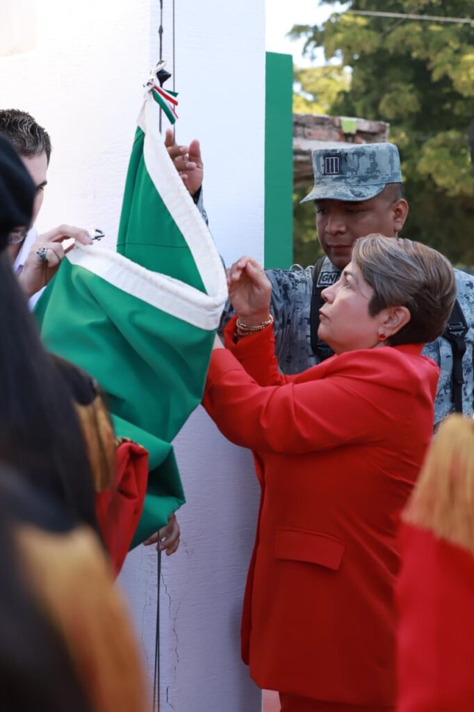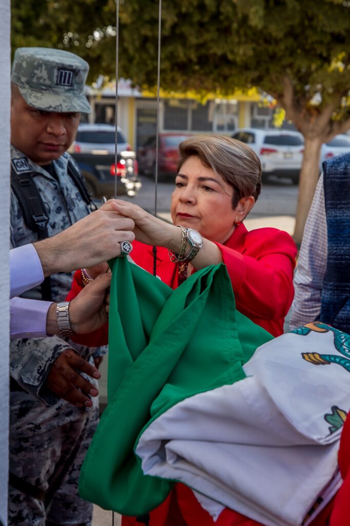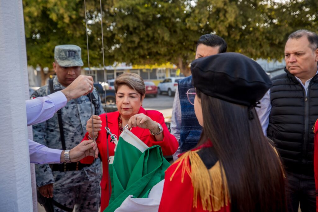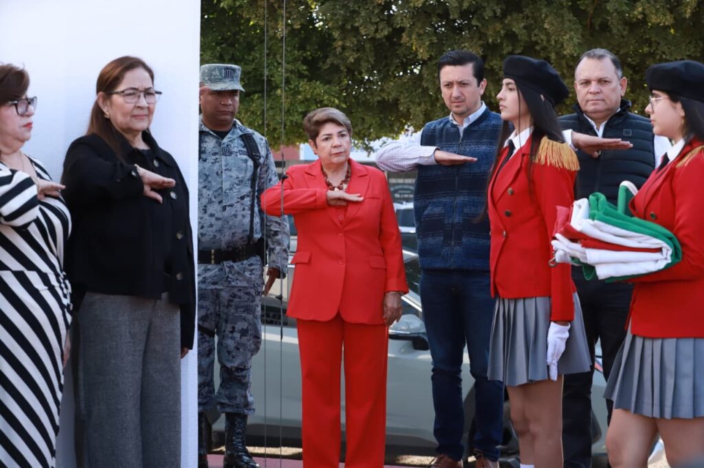 La presidenta municipal, la Dra. Cecilia Ramírez Montoya, encabezó el izamiento a toda asta, acompañada por funcionarios, representantes educativos y elementos de seguridad, en una ceremonia organizada por la Dirección General de Educación y Promoción Social.